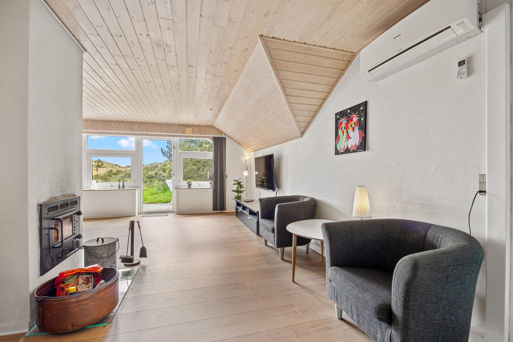 Der eingebaute Kamin sorgt mit dem Knistern des Holzes für das Extra an Gemütlichkeit und die große Fensterpartie im Wohnraum lässt viel natürliches Licht in den Raum. Bei Bedarf könnt ihr die energiesparende Wärmepumpe einschalten.
