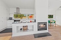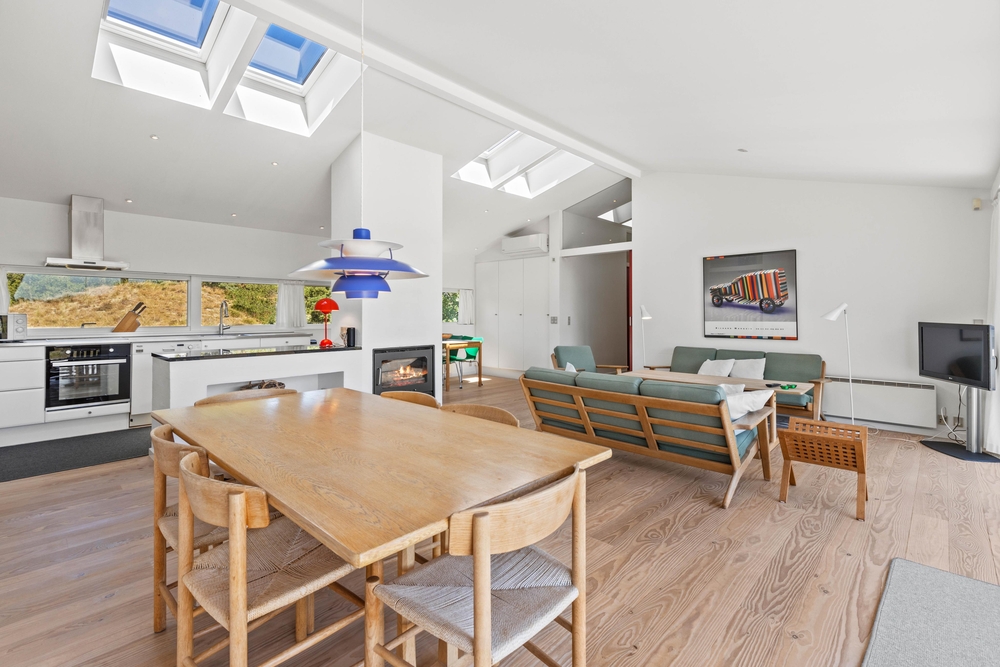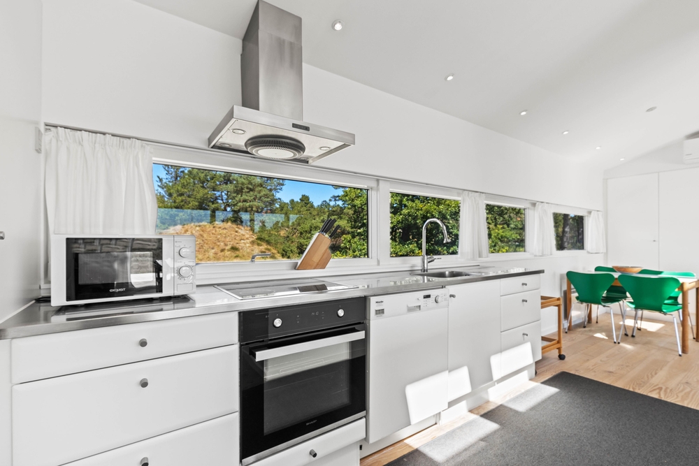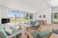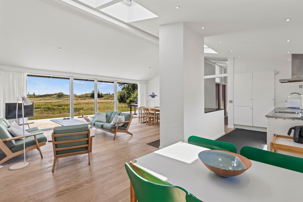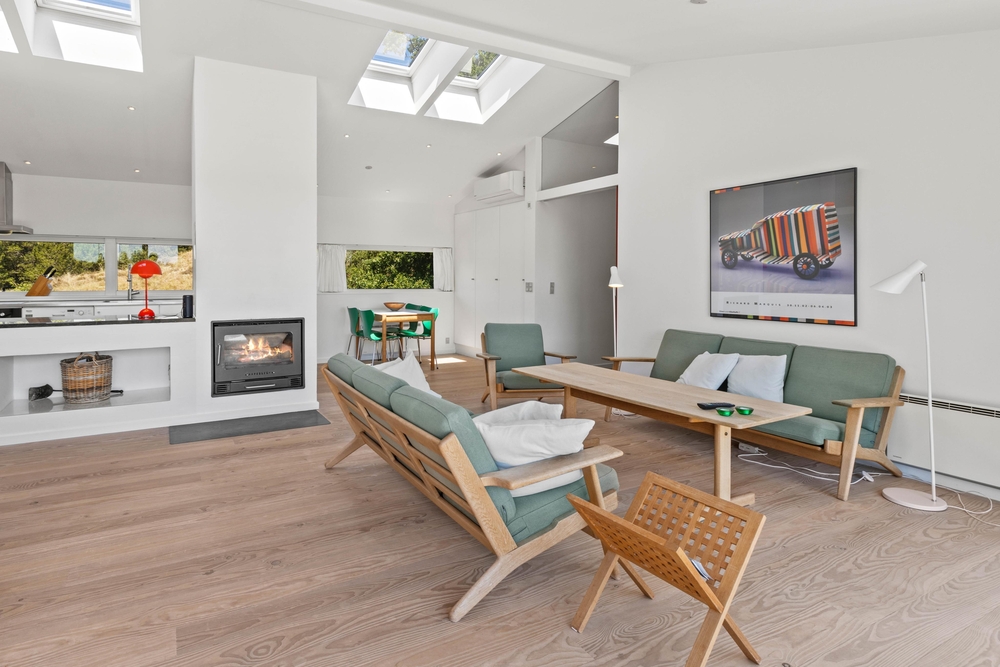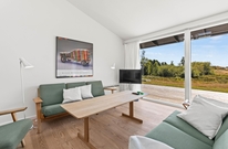 Im Wohnbereich ist eine gemütliche Sofagarnitur mit vielen Sitzmöglichkeiten und einem wunderschönen Blick nach draußen ins Grüne. Sowohl die Schlafzimmer als auch der Wohnbereich sind mit großen Fenstern ausgestattet, die das Ferienhaus mit viel Wärme und Licht durchfluten. Oberlichter gibt es ebenfalls, sie sorgen für eine tolle Belichtung im Innenraum.