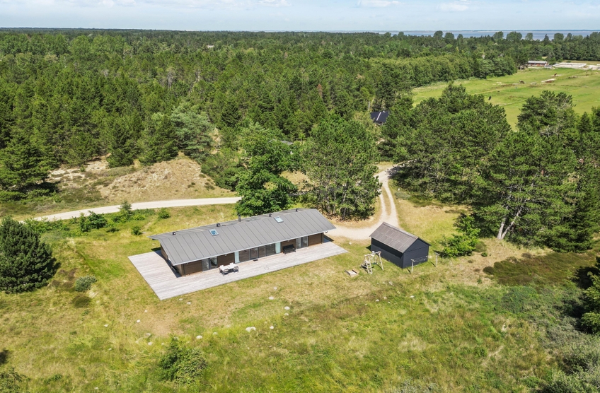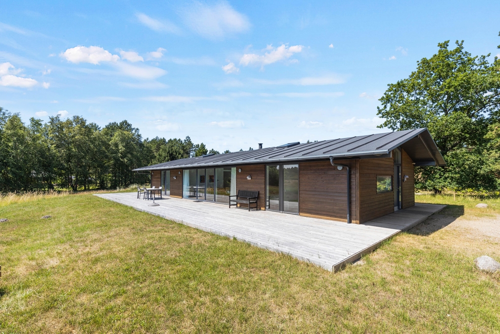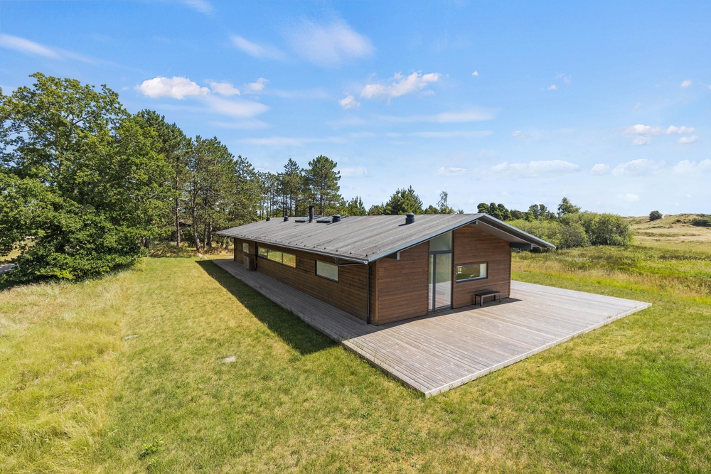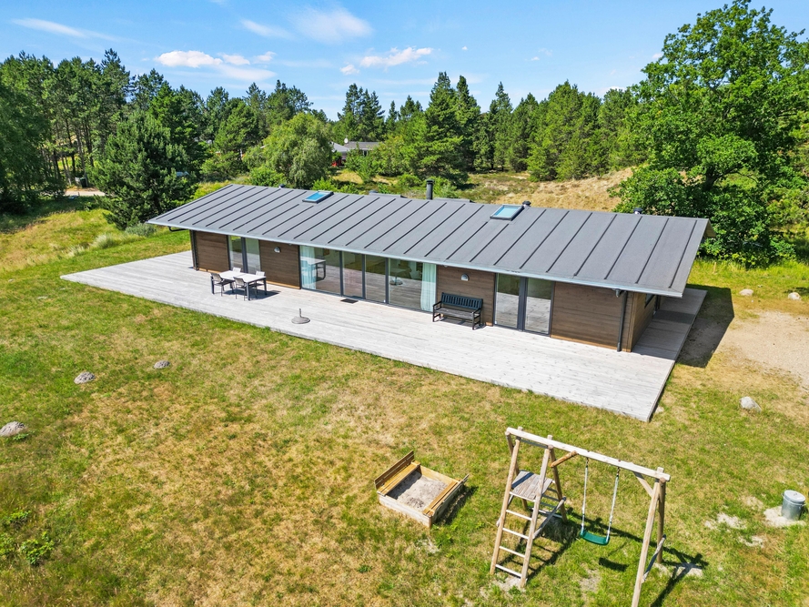 Der Außenbereich ist traumhaft schön, es führt eine Holzterrasse komplett um das Ferienhaus herum. Im Garten gibt es für die Kinder einen Sandkasten und eine Schaukel. Zudem ist die Terrasse mit Gartenmöbeln, Sonnenliegen und einem Grill ausgestattet.