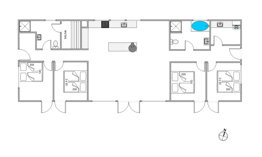 Das moderne Holzhaus verfügt über insgesamt 4 Schlafzimmer mit 2 bequemen Doppelbetten 180×200 cm und 140x200cm und 4 Einzelbetten 80x200cm. Das Ferienhaus verteilt sich auf 142 m2, wurde 2003 erbaut und hat Platz für 8 Personen.