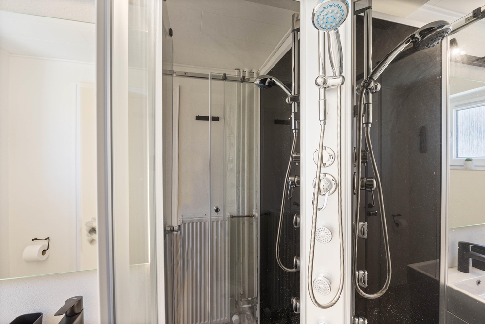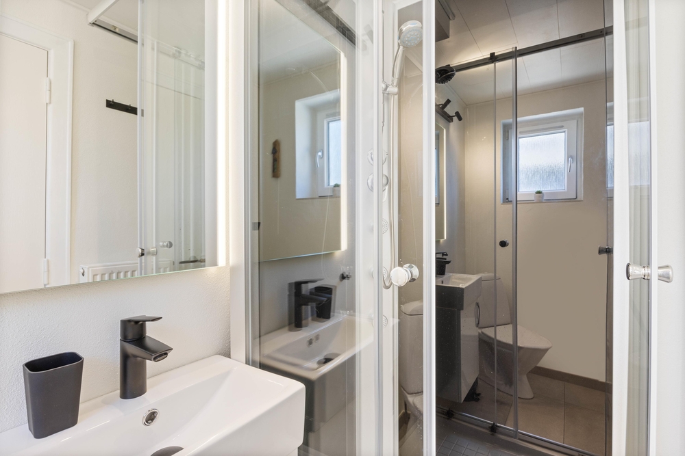 Im Sommerhaus findet ihr ein geräumiges Badezimmer und praktischerweise noch eine Gästetoilette. Das Ferienhaus wird mit Fernwärme versorgt und ist somit kostengünstig im Verbrauch. Für die Wäsche zwischendurch gibt es eine Waschmaschine und einen Trockner im Ferienhaus.