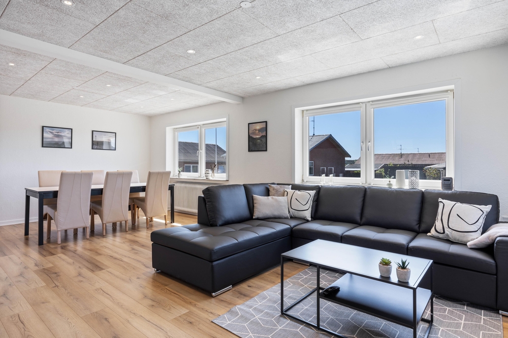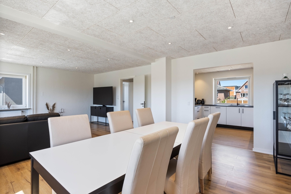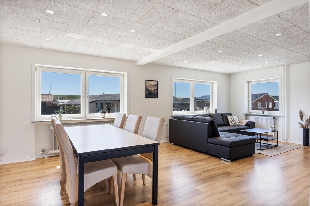 Das 90 m² Sommerhaus in der Vestergade bietet Euch ein gemütliches Wohnzimmer mit Holzfußboden und einer bequemen Sofaecke mit Flachbildschirm und deutschen Programmen. Im Wohnraum trifft man sich zum gemeinsamen Essen oder auch für Gesellschaftsspiele am Esstisch.