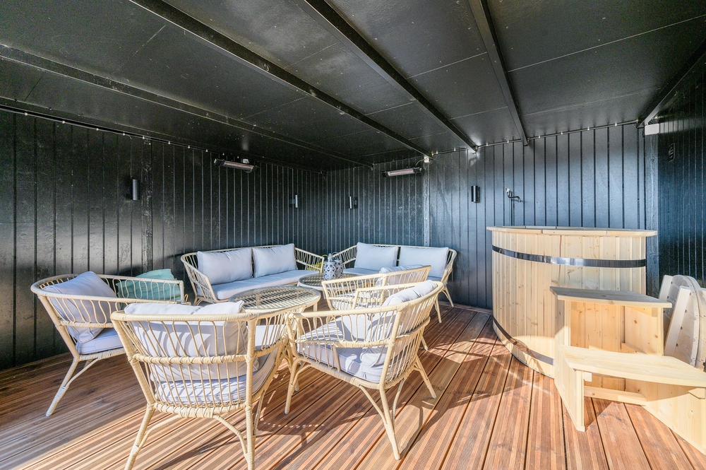 Wer es gern gemütlich und kuschelig mag, nutzt die Badewanne im Haus, um ein ausgiebiges Schaumbad zu nehmen und zu entspannen. Der Terrassenbereich ist riesig und bietet viele verschiedene Sitzmöglichkeiten, wo ihr relaxen und das Leben draußen in vollen Zügen genießen könnt. Die teilweise überdachte und geschlossene Terrasse ist perfekt, um komplett abzuschalten. Kleine Kinder aber auch eure Hunde sind hier gut im Auge zu behalten und somit könnt ihr hier total vom Alltag abschalten.