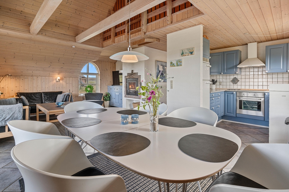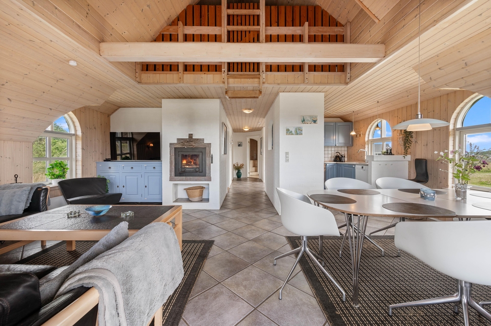 Der kombinierte Wohnraum mit Küche, Esszimmer und Sitzecke sorgt durch seine Holzdecken- und Balken für viel Gemütlichkeit und der Kamineinsatz sorgt sowohl für eine wohlige Wärme und mit dem Knistern des Holzes könnt ihr die Seele baumeln lassen. Gemeinsames Kochen in der offenen Küche mit Geschirrspüler, lustige Brettspiele am Esstisch mit den Kindern oder ein gemütlicher Filmeabend auf dem Sofa sorgen für viele schöne Stunden mit der ganzen Familie.