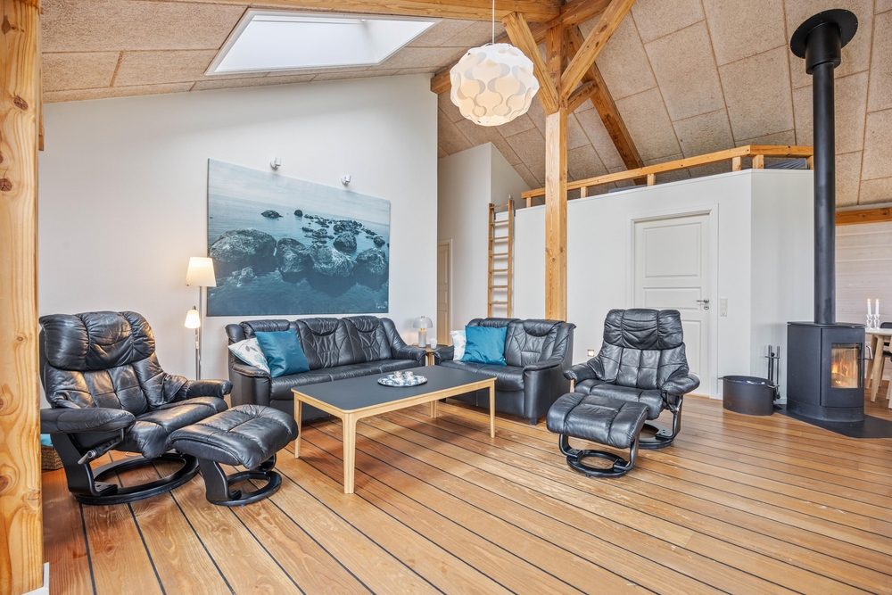 Das Ferienhaus kann mit einer modernen Einrichtung und umfangreicher Ausstattung mit diversen Highlights überzeugen. Im Wohnbereich, der mit der modernen Küche zusammen das Herz des Ferienhauses bildet, stehen neben gemütlichen Sofas auch der Kaminofen und der Esstisch, an dem ihr ausgiebige Spieleabende veranstalten könnt. Vom Sofa aus könnt ihr durch die großen Fenster auf das Naturgrundstück blicken.