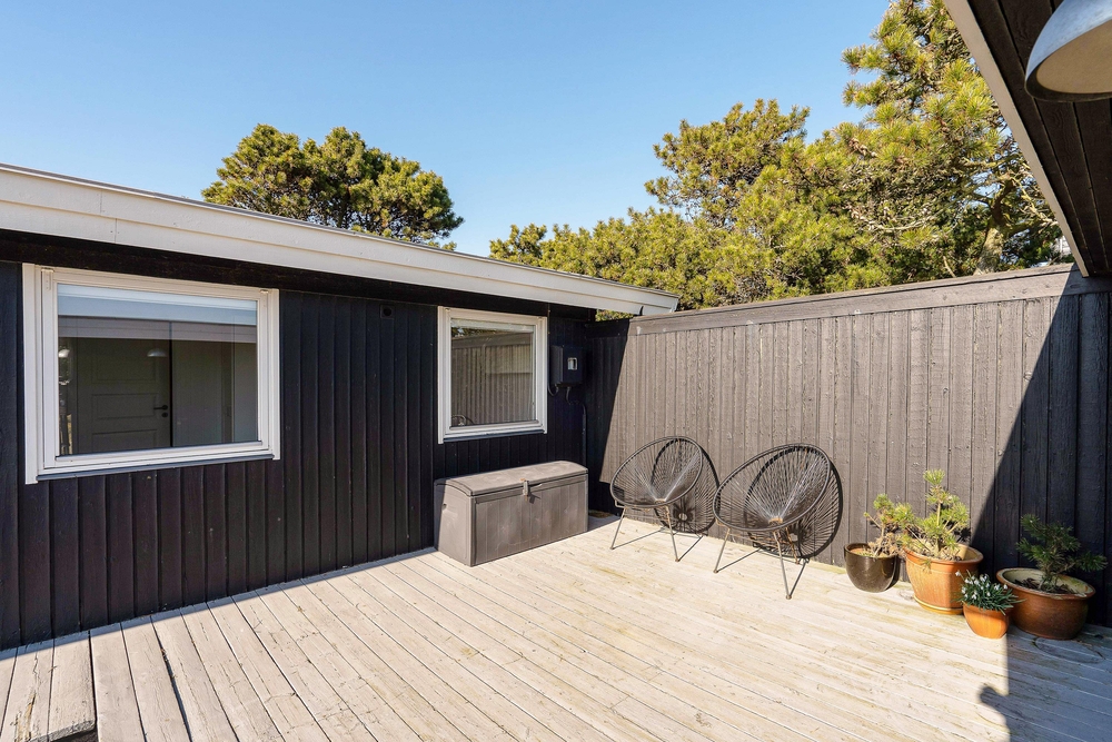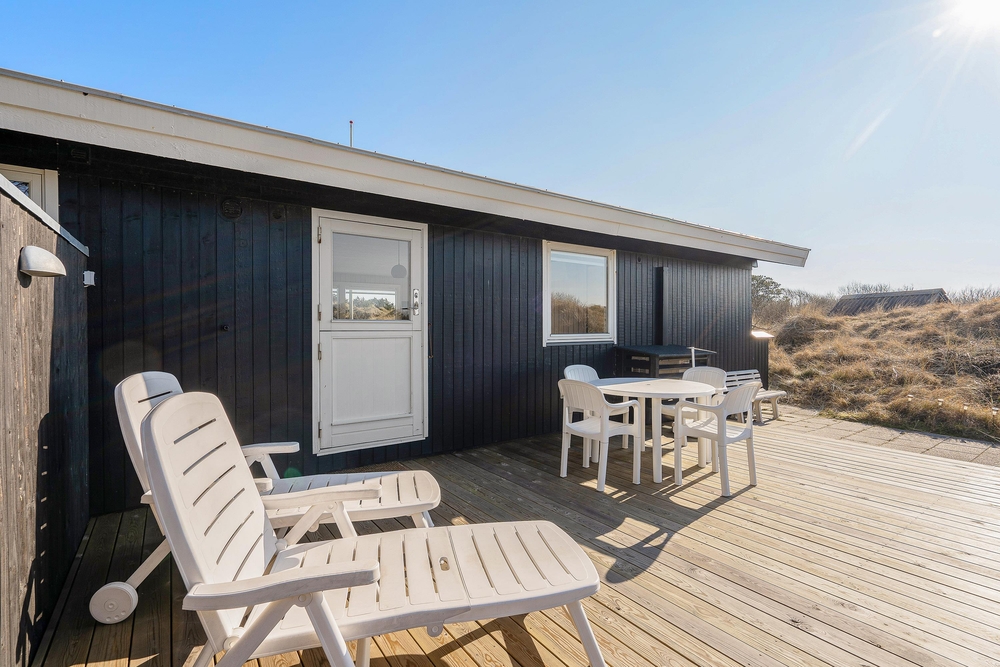 Die Rückseite des Ferienhauses ist von Büschen abgeschirmt, so wohnt ihr gut geschützt im Vindgaf 36. Rund um das Ferienhaus gibt es verschiedene Terrassen, wovon eine überdacht ist und ihr unabhängig der Witterung, jederzeit im Freien sitzen und die schöne Natur mit der klaren Nordseeluft genießen könnt.
