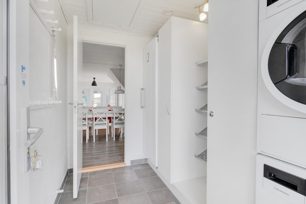 Die gut ausgestattete Küche verfügt über einen Geschirrspüler. Im Raum nebenan stehen ein Wäschetrockner und eine Waschmaschine.