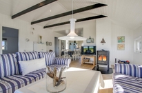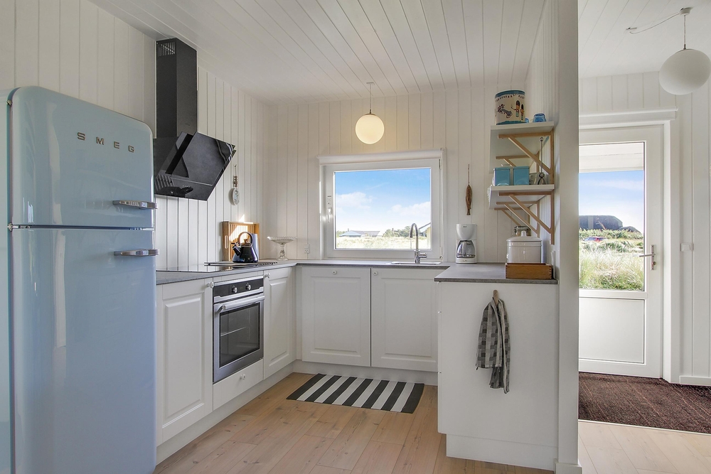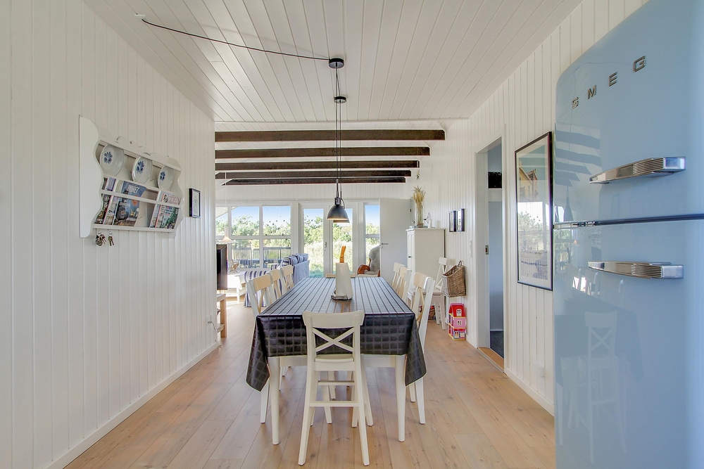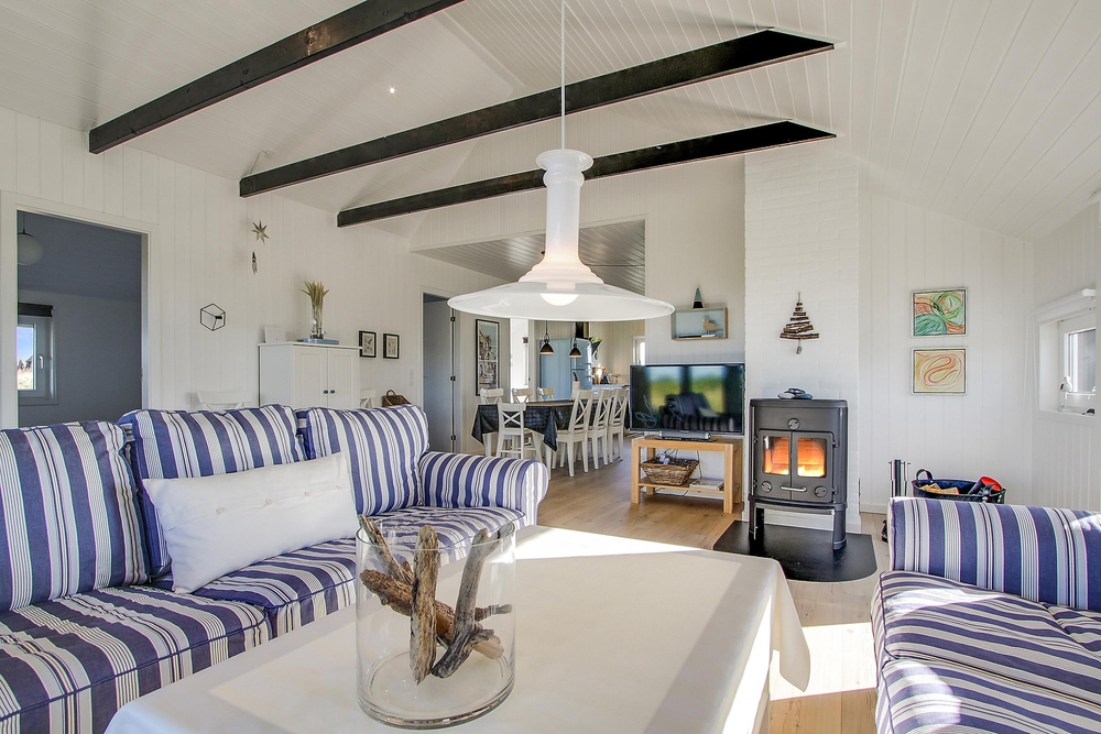 Die hellen Holzwände und die hohe Decke in Verbindung mit den äußerst geschmackvollen Möbeln verleihen dem Ferinehaus einen romantischen Touch, sodass man sich sofort wie zu Hause fühlt und die Urlaubsatmosphäre spüren kann. Gleichzeitig zeichnet sich die Einrichtung durch feine Details wie blau gestreifte Sofas, einem hellblauen SMEG-Kühlschrank und kleine Details aus Treibholz aus, die dem Haus einen fast maritimen Charakter verleihen. Sehr passend für ein Haus, das so nah am Wasser liegt.